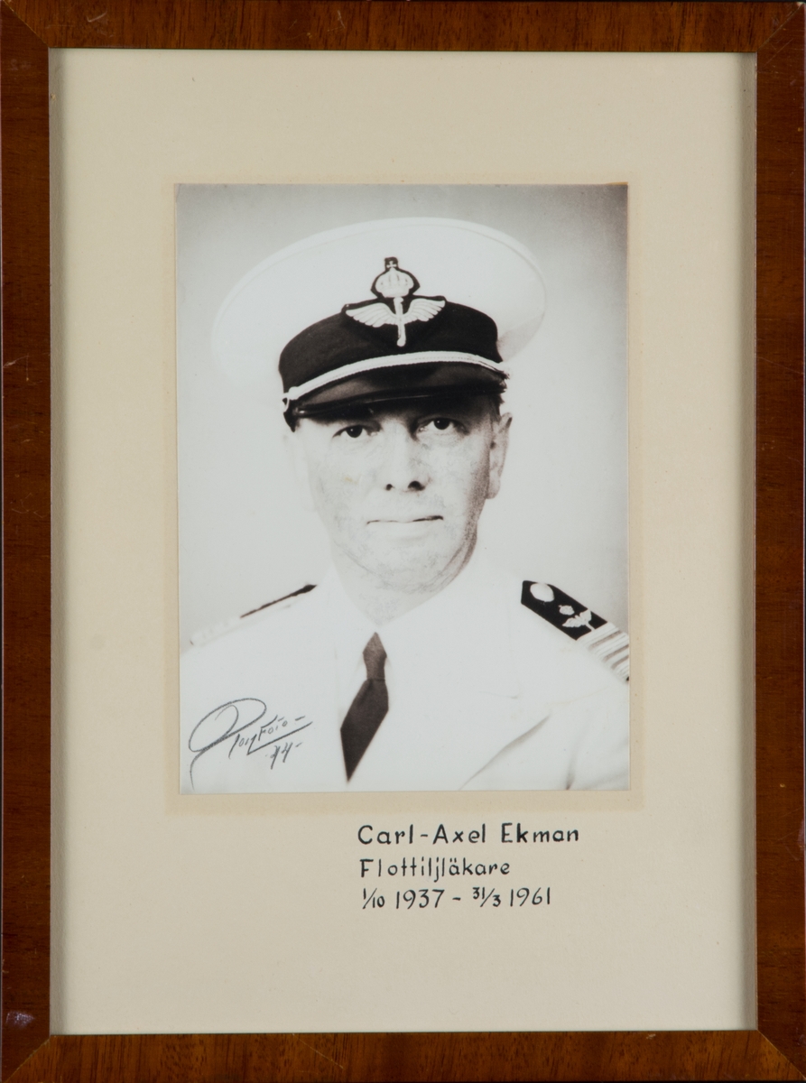 Porträttfotografi av Carl-Axel Ekman, flottiljläkare på F 3 Malmen. Inramat foto.