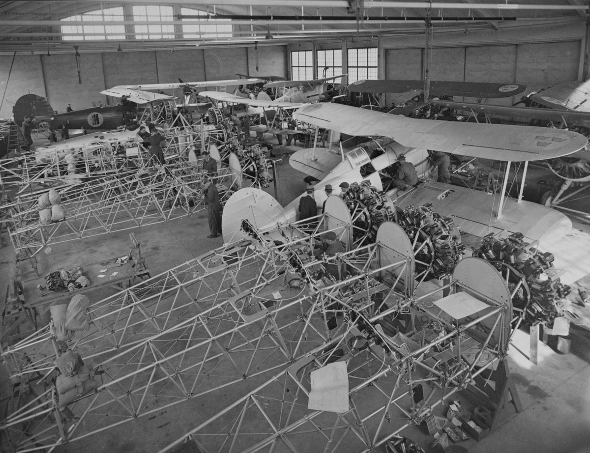 Montering av flygplan B 4 på Centrala verkstaden Malmslätt. Personer i arbete.