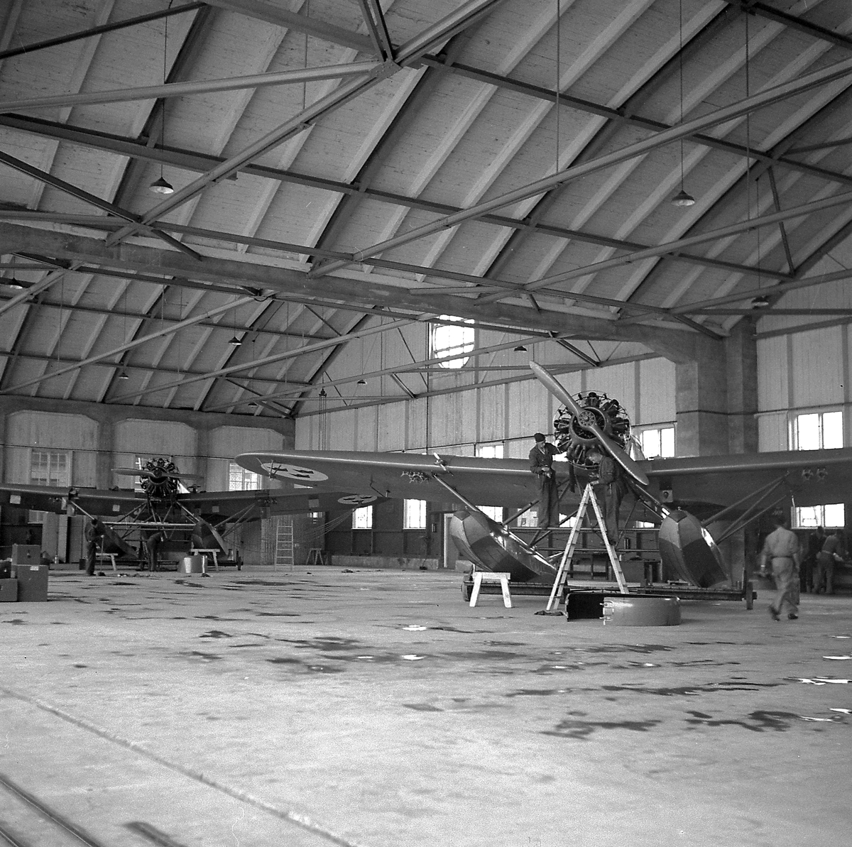 Interiör av hangar vid Karlskrona flygstation, 1937. Flygplan S 5 uppställda.