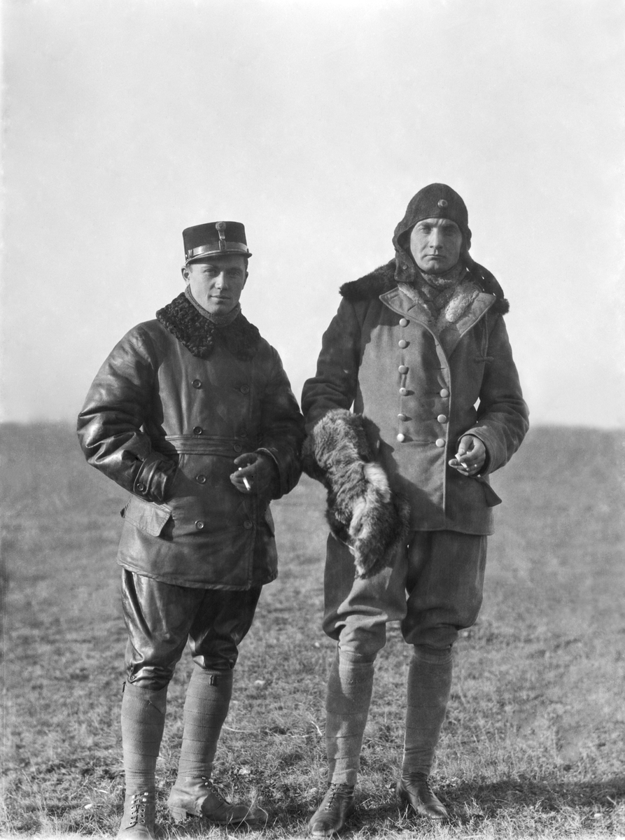 Portättfoto av två militära flygare från Österrike-Ungern med cigarett i hand.