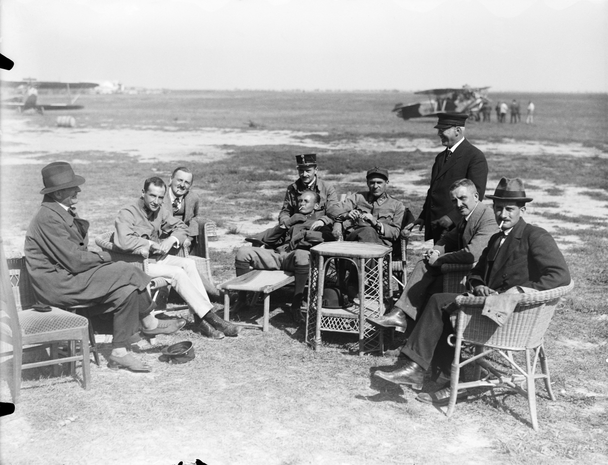 En samling om 9 män sitter i stolar i utkanten av ett flygfält i Österrike-Ungern under första världskriget. I bakgrunden står militära flygplan.