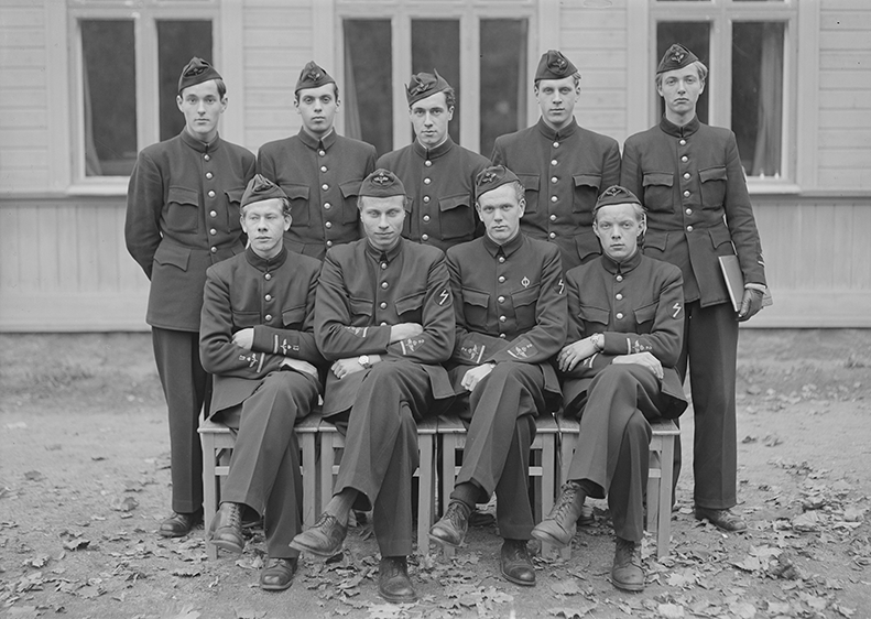 Elever vid korpralskolan för signalmekaniker på F 3 Östgöta flygflottilj, 1946. Del av klass, nio stycken elever. Grupporträtt framför byggnad.