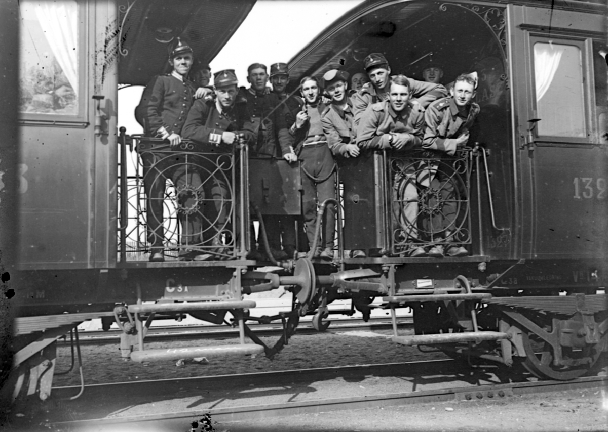 Gruppporträtt. En samling armésoldater från I 4 och / eller I 5 regemente står på en tågvagn.