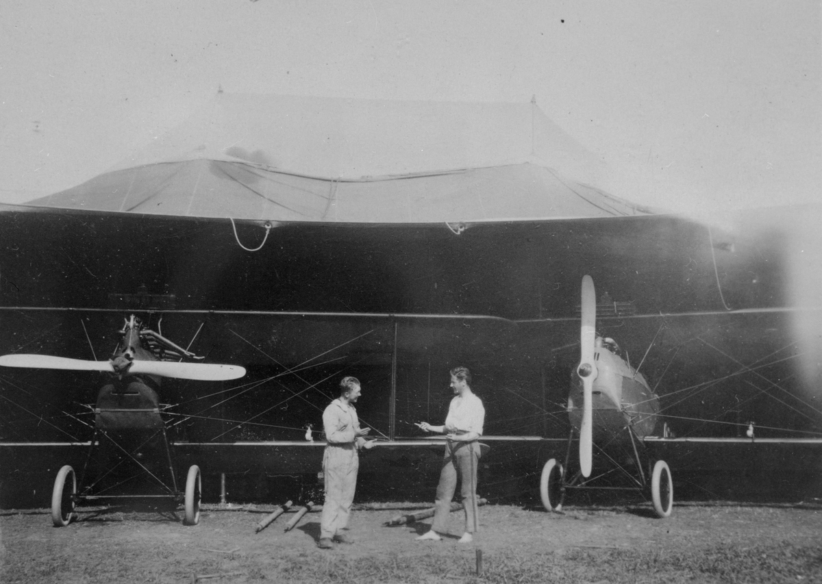 Två militära flygmekaniker samtalar framför en tälthangar med flygplan Albatros BII och Phönix C.I