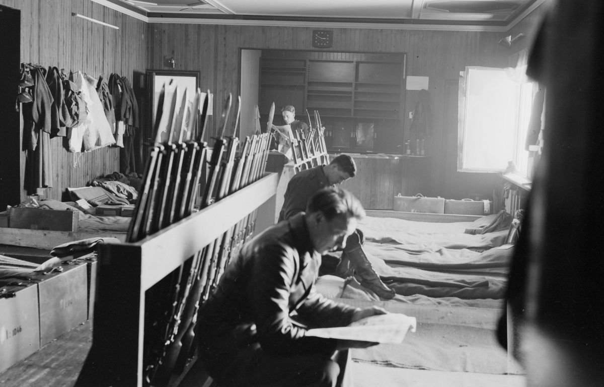 Interiör av en manskapsbarack vid F 19, Svenska frivilligkåren i Finland. Militärer, sovplatser och gevär.