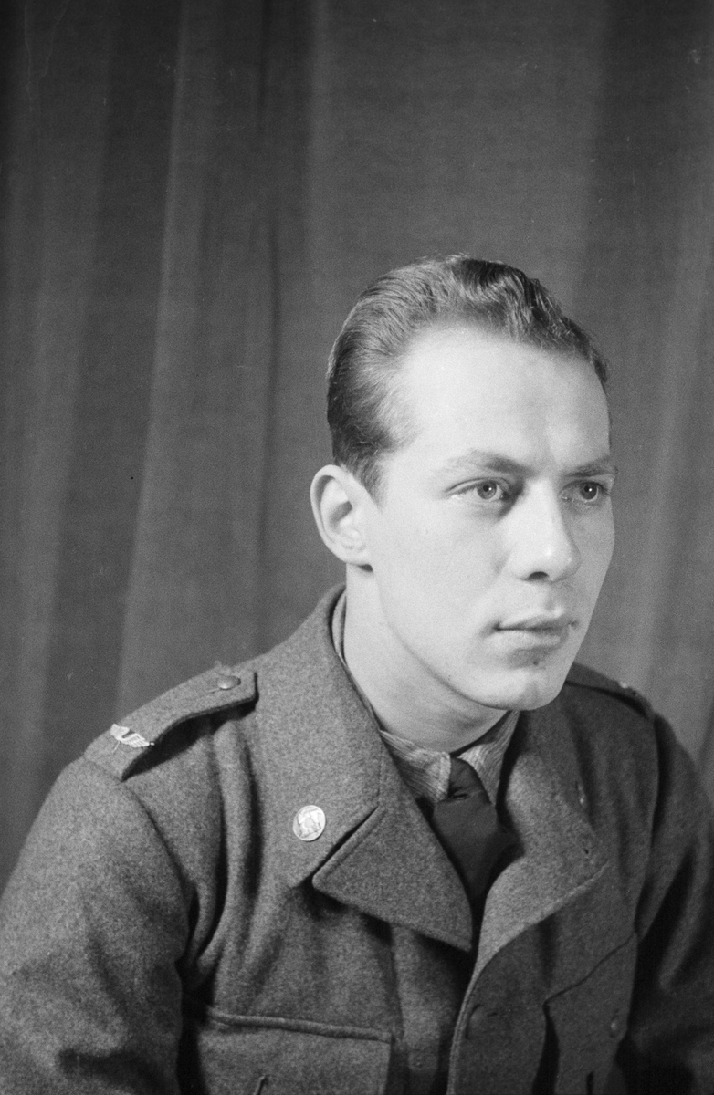 Porträttfoto av sergeant Leif Johannes Svensson (nummer 3021), flygplanmontör vid F 19, Svenska frivilligkåren i Finland under finska vinterkriget, 1940.