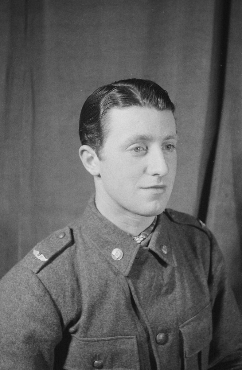 Porträttfoto av soldat Per Hjalmar Johnsson (nummer 821), mekaniker vid F 19, Svenska frivilligkåren i Finland under finska vinterkriget, 1940.