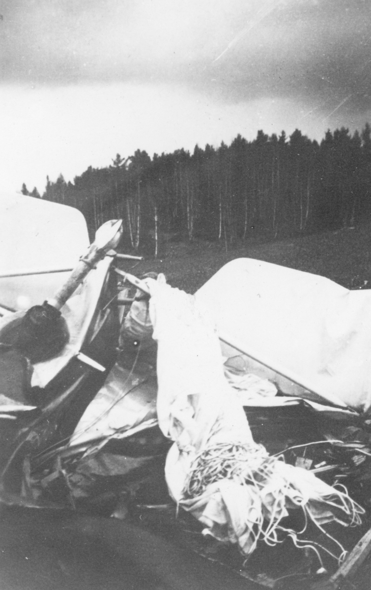Havererat militärt flygplan ligger på ett fält. Bland resterna finns en utlöst fallskärm.