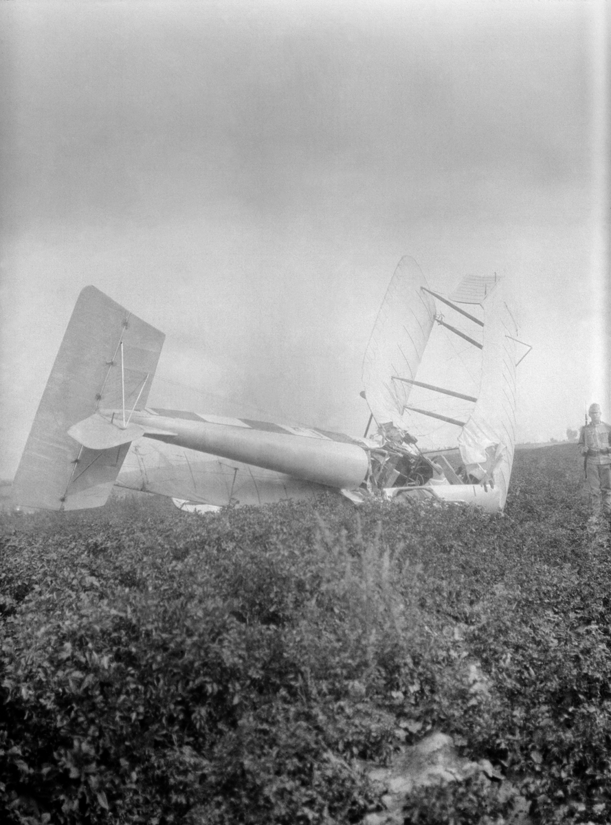 Havererat militärt flygplan Lohner Type C nr C 12 tillhörande Österrike-Ungern ligger på ett fält. En militär står vid flygplanet. Vy snett bakifrån.