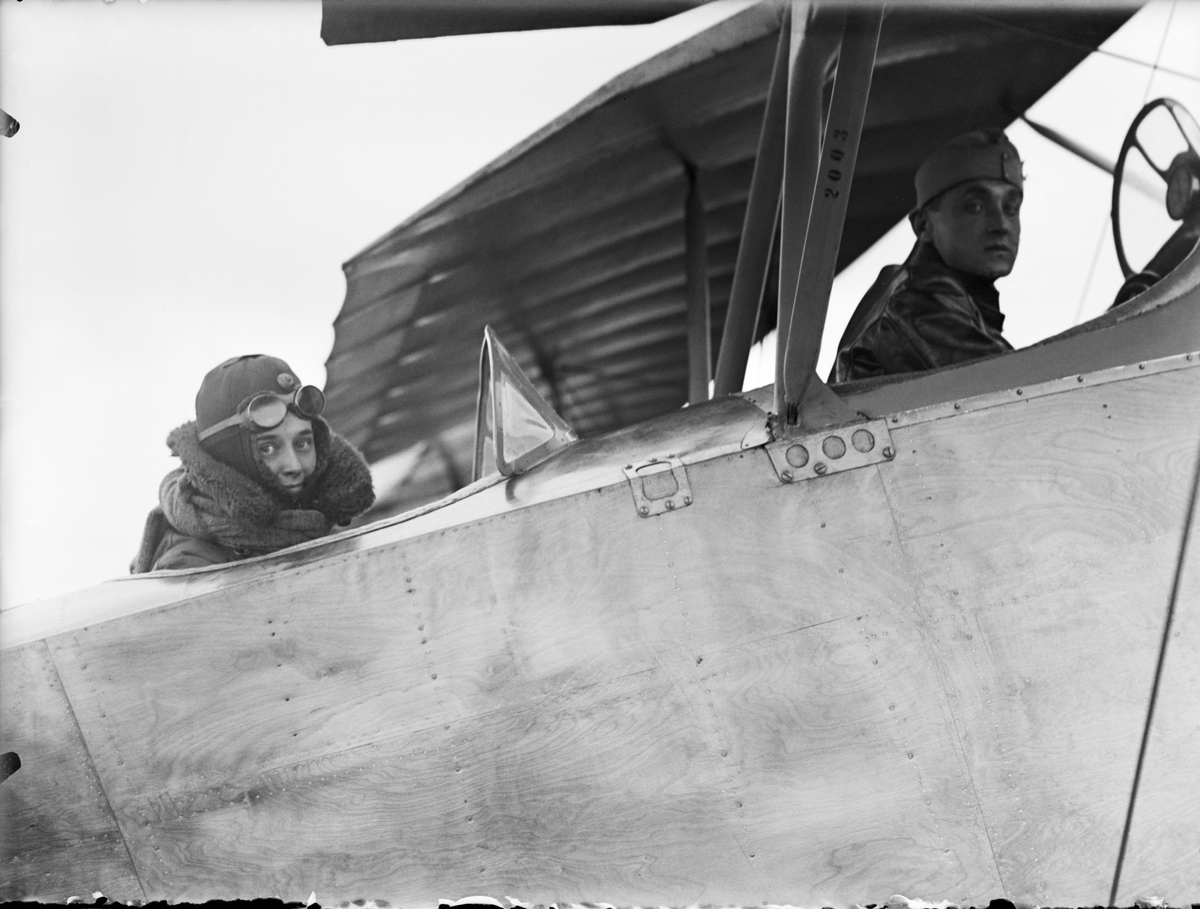 Flygförare och kvinnlig passagerare i militärt flygplan Albatros B.I märkt 20.03 tillhörande Österrike-Ungern. Inför flygning i flygplanet. Vy från sidan.