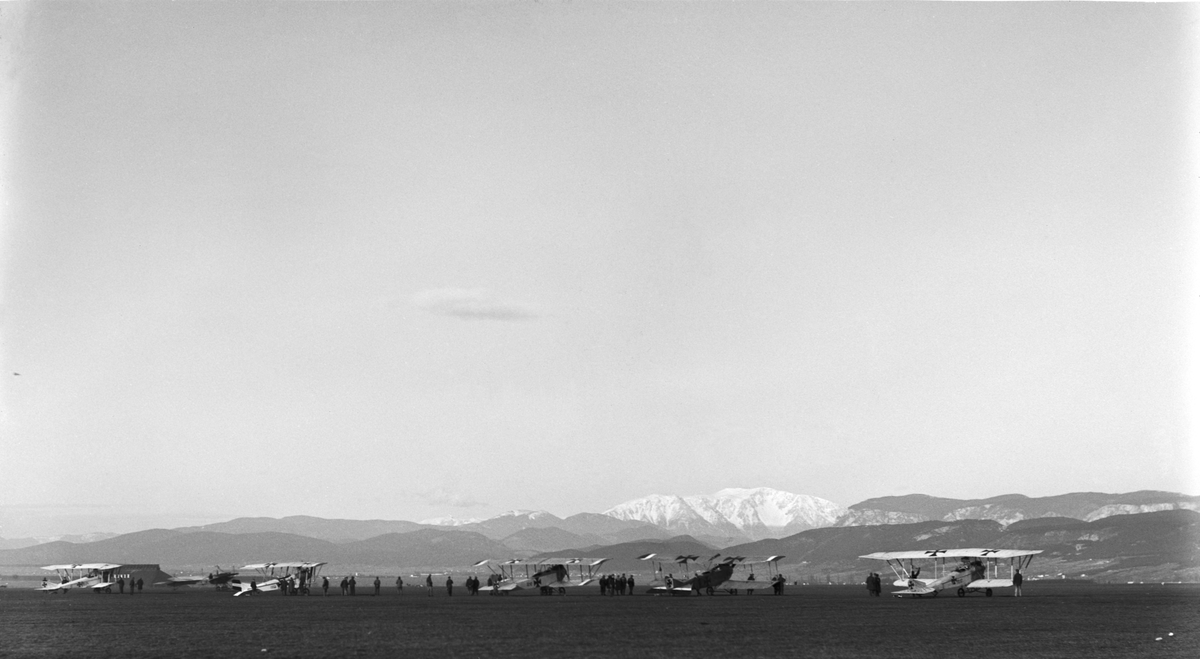 Vy över flygfält med militära flygplan tillhörande Österrike-Ungern. Höga berg i bakgrunden. Vy bakifrån. Flygplan av modell Lohner B, Albatros B.I, Aviatik B.II och Etrich Taube.