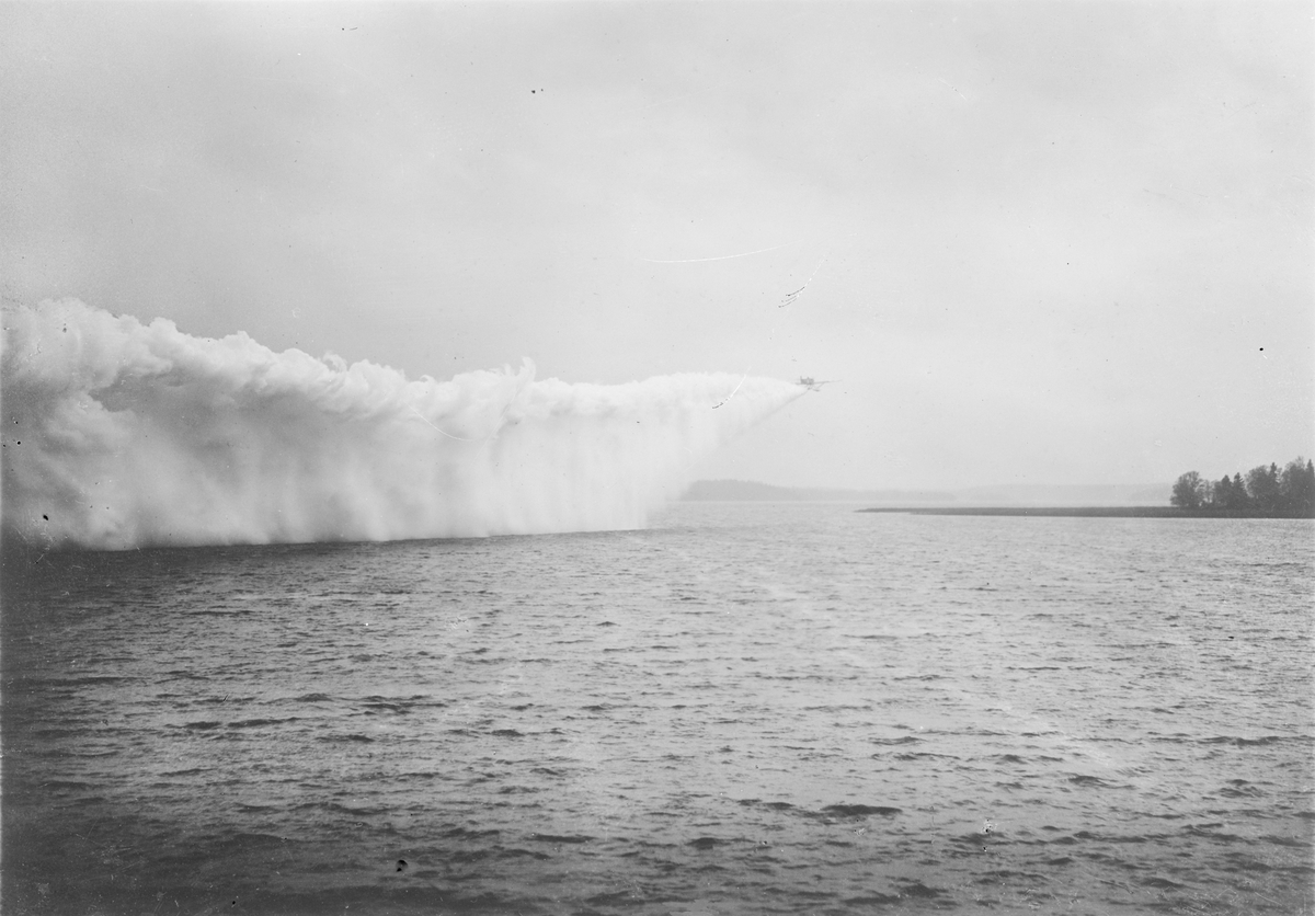 Dimbildning. Flygplan S 5 lägger en dimridå vid havskust.