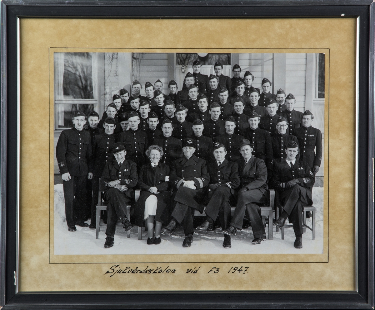 Grupporträtt av personal och deltagare i sjukvårdsskolan på F 3 Malmen, 1947. Vintertid. Inramat foto.
