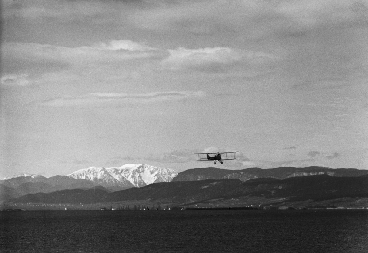 Militärt flygplan Albatros B.I tillhörande Österrike-Ungern flyger över flygfält. Vy bakifrån. Höga berg i bakgrunden.