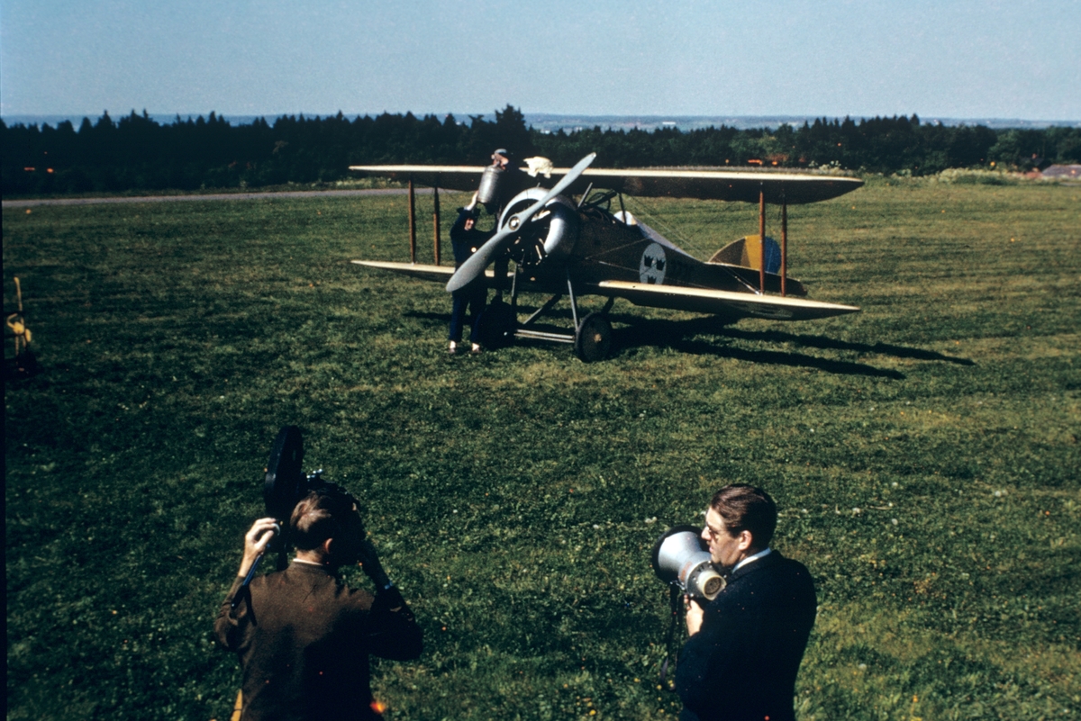 Klargöring av flygplan FVM Tummeliten märkt nummer 3656 vid flygdagarna på Malmen 1-2 september 1962, vid firande av militärflyget 50 år. I förgrunden står en man vid en filmkamera samt en speaker med megafon.