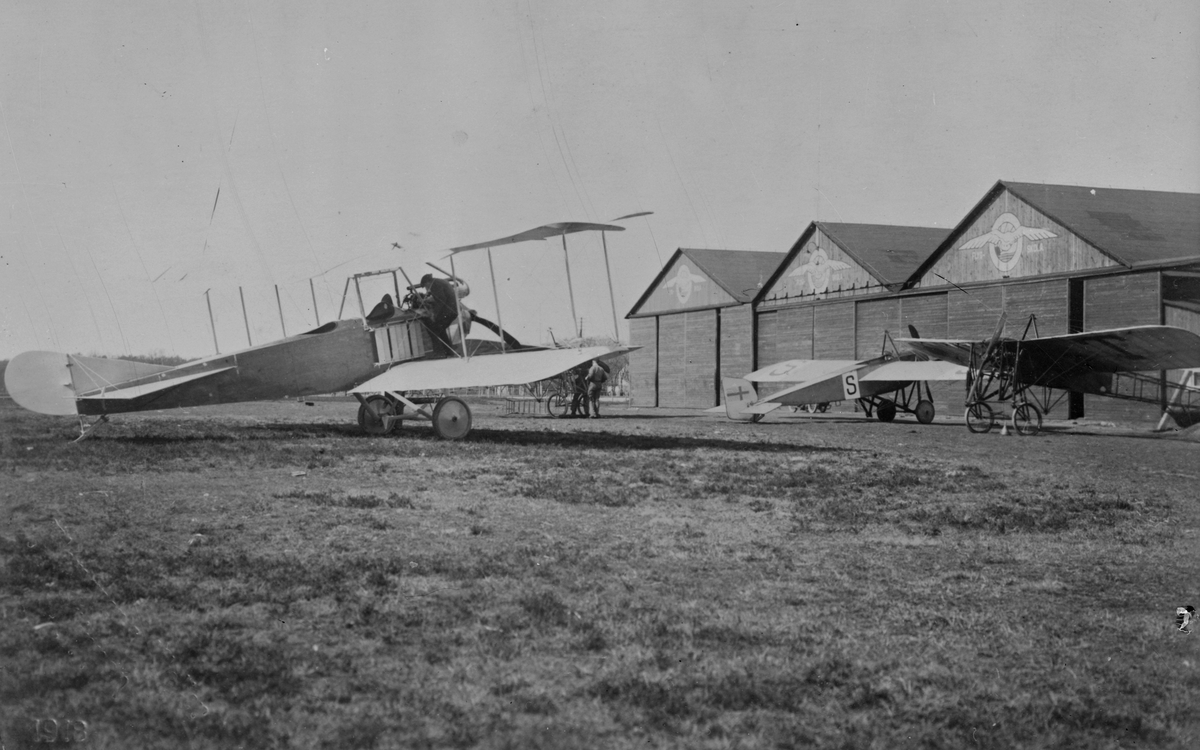 Tre flygplan framför hangarer på Enoch Thulins flygskola. Från vänster flygplantyp Thulin C / Albatros SW 12, Thulin B samt Thulin A.