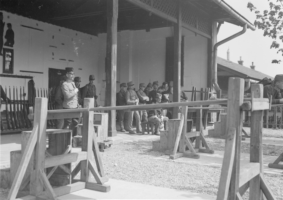 Militärer från Österrike-Ungern vid skjutbana, cirka 1914-1915. Gevär uppställda i bakgrunden.