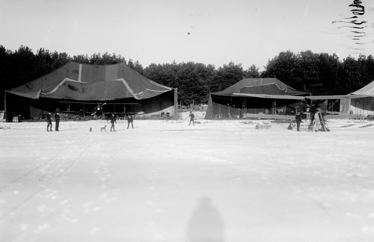 Två hangarer vid Hägernäs flygstation, vintertid, 1923. Personer i rörelse och i arbete med flygplan Albatros.