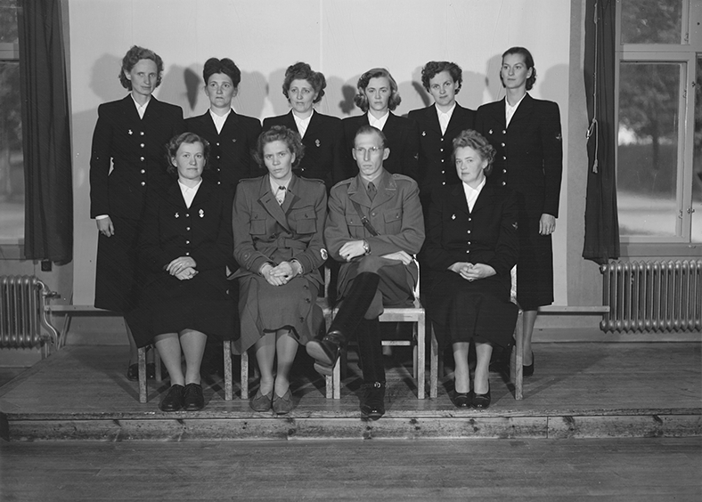 Lottagrupp på examensdagen på F 3 Östgöta flygflottilj, 1949. Grupporträtt tillsammans med instruktör, inomhus.