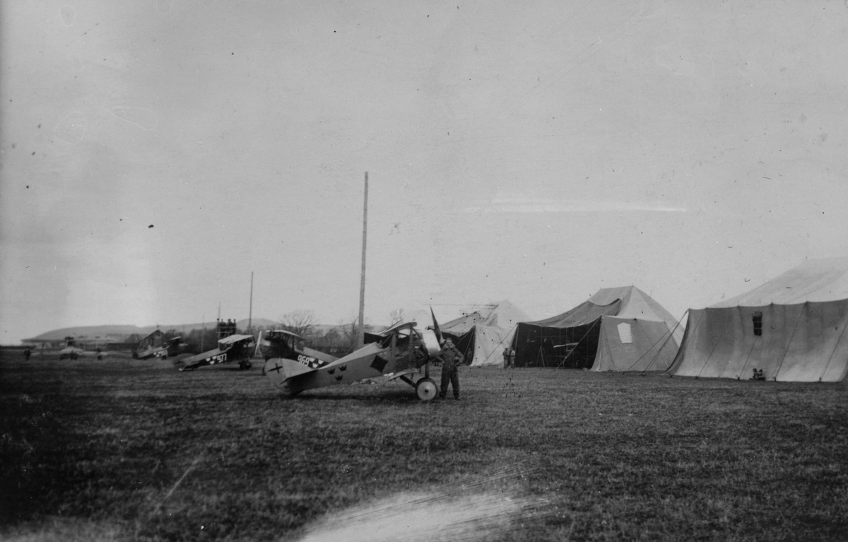 Flygplan Tummeliten 'Ruter ess' och flygplan Phönixjagaren vid tälthangarer vid Stora Lund, Hästholmen, 1923. En flygare står vid flygplanets nos.