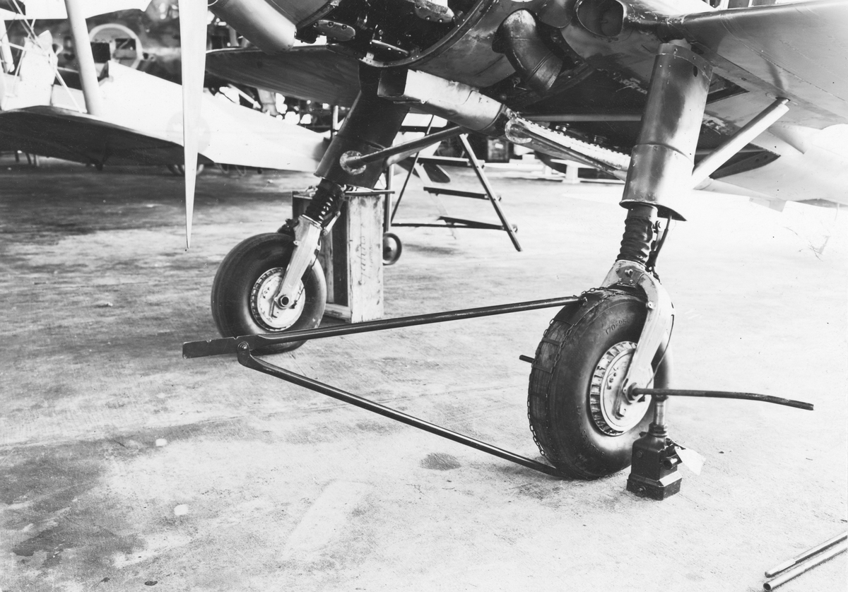 Snökedja monterad på hjulen på flygplan J 11 inne i verkstad. Närbild.