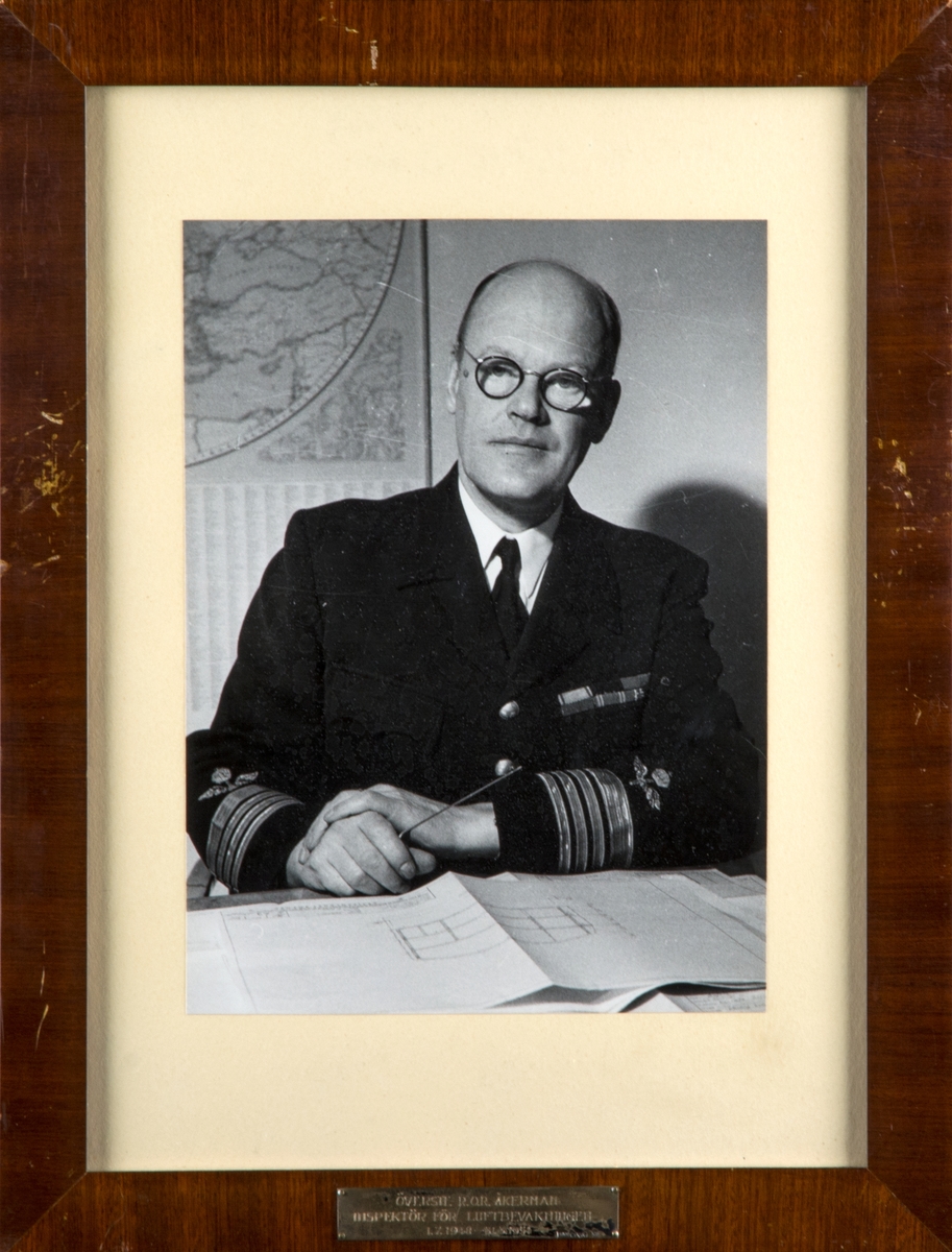 Porträttfotografi av Richard Åkerman, inspektör för Luftbevakningen 1948-1951. Inramat foto.