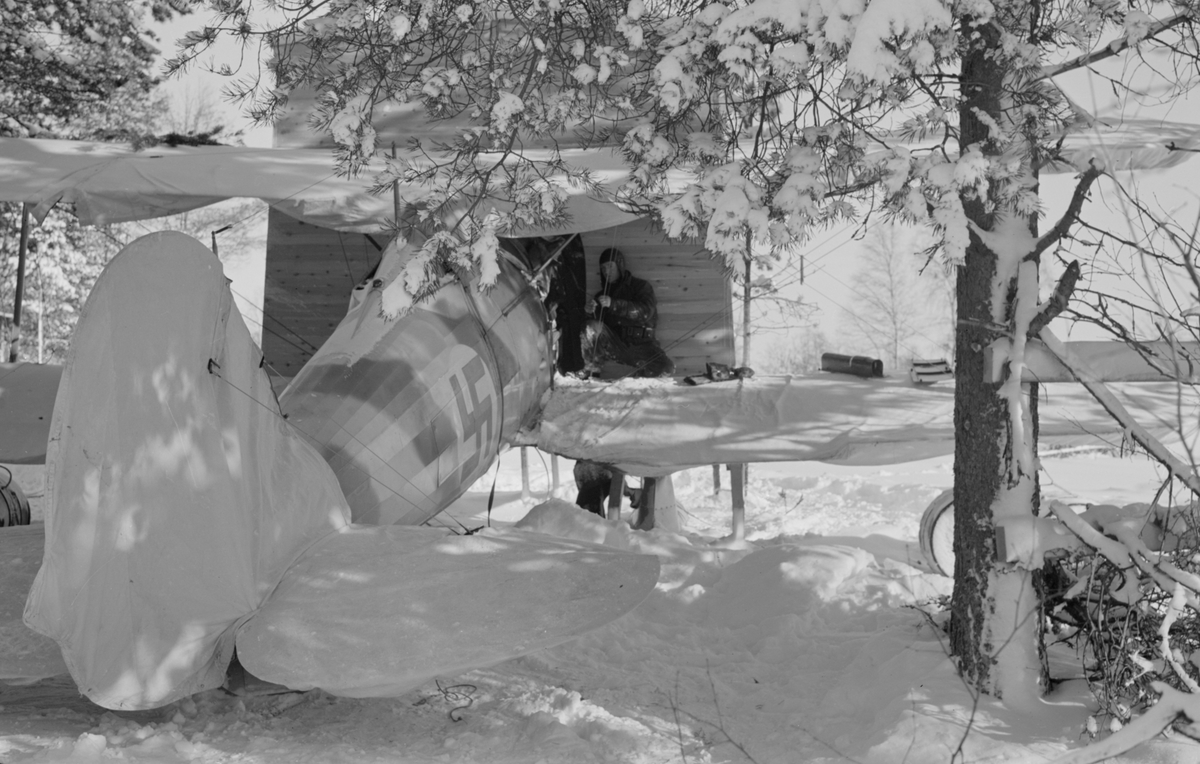 Flygplan Gloster Gladiator tillhörande F 19, Svenska frivilligkåren i Finland, står i ett värn. Militär i arbete på flygplanets vinge. Vy bakifrån.