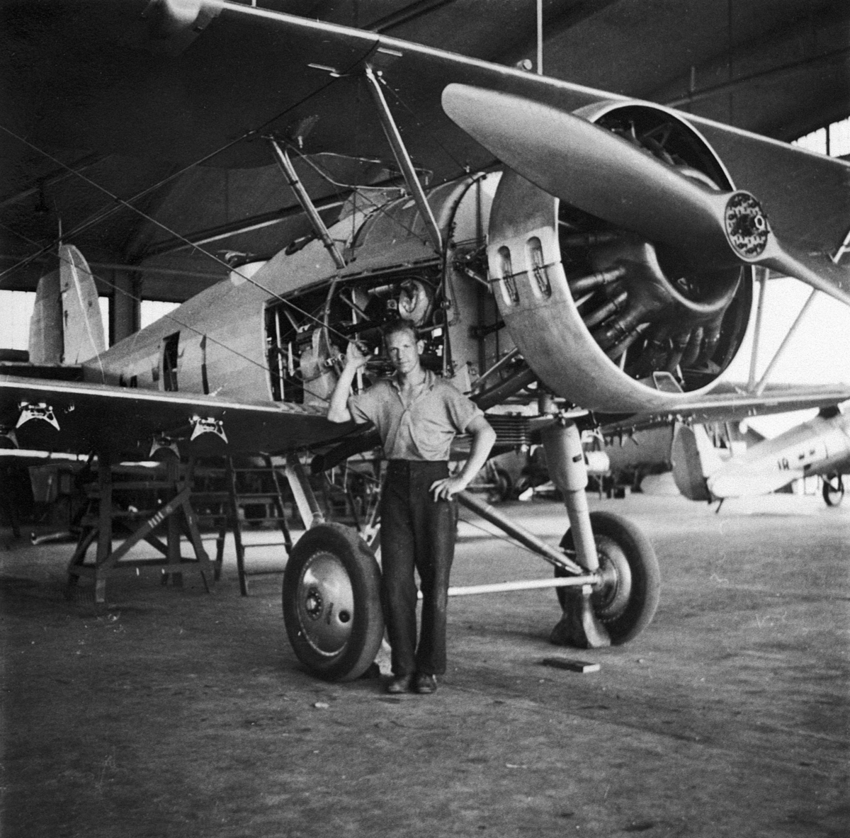 En man står vid flygplan B 4, Hawker Hart på Centrala flygverkstaden Malmslätt, 1930-tal.
