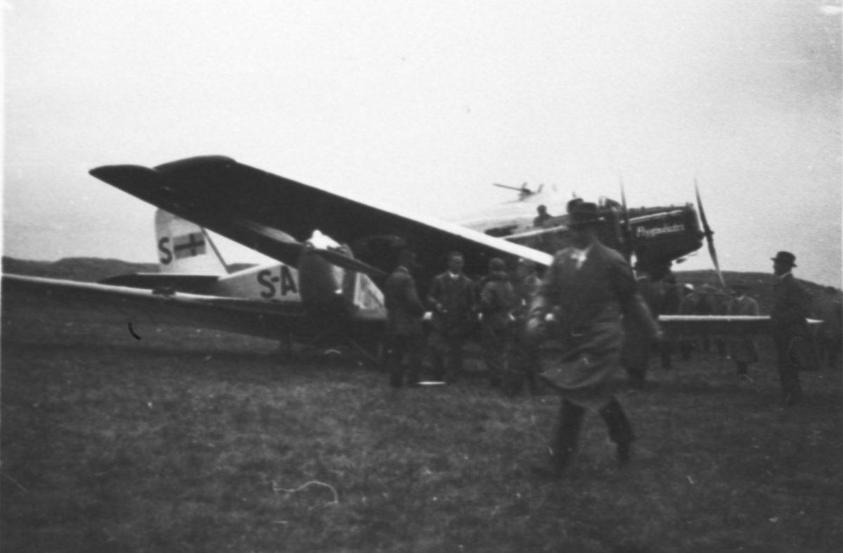 Civilregistrerat flygplan Junkers K 30c tillhörande Svensk flygindustri står på ett flygfält. En folksamling står vid flygplanet. Förmodligen flygplan S-AABF.