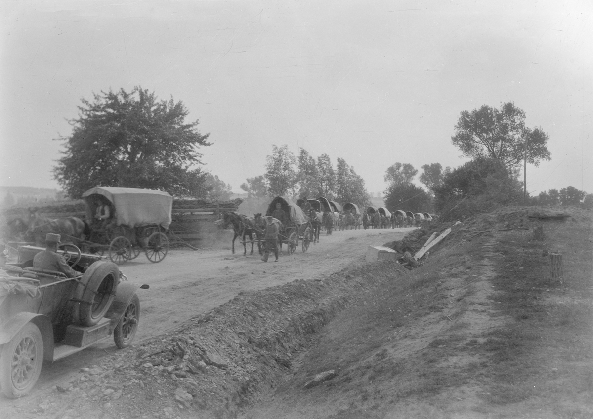 13 hästekipage med vagn och militärer samt en bil på en väg vid militäranläggning under första världskriget. Tillhörande Österrike-Ungern.