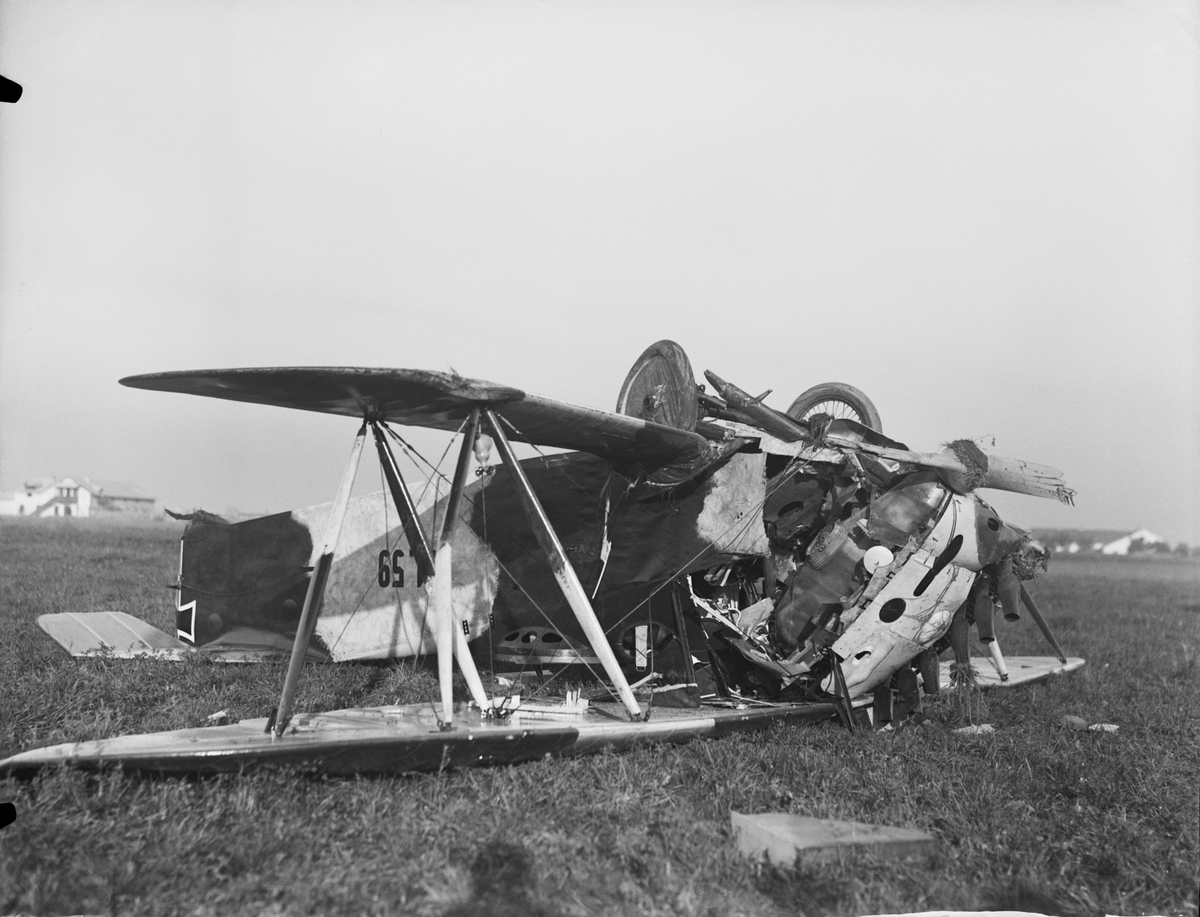Havererat militärt flygplan Phönix C.I märkt 121.59 tillhörande Österrike-Ungern ligger upp-och-ned på ett flygfält. Vy från sidan.