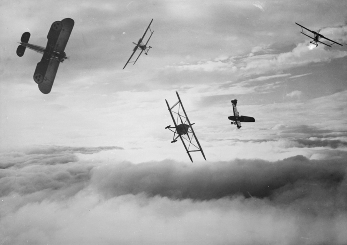 Luftstrid, övning. Fem stycken flygplan i luften.