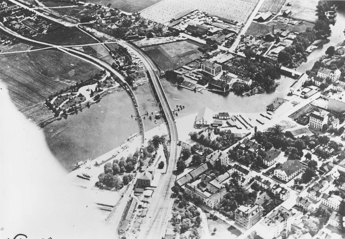 Flygbild av Linköping och Stångån, ca 1917. Stångebro överst till vänster, Tannefors överst till höger och centrala delarna nederst.