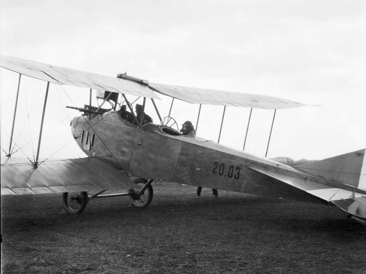 Militärt flygplan Albatros B.I märkt 20.03 tillhörande Österrike-Ungern på ett flygfält inför flygning med kvinnlig passagerare. Vy från sidan.