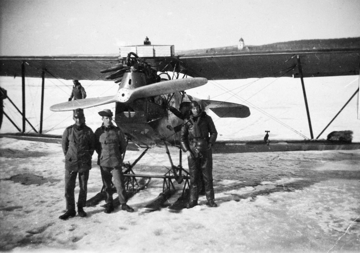 Grupporträtt av tre oidentifierade militärer framför flygplan FVM S 21 på isen utanför Rättvik, 1921. Till vänster två mekaniker, till höger en flygförare.