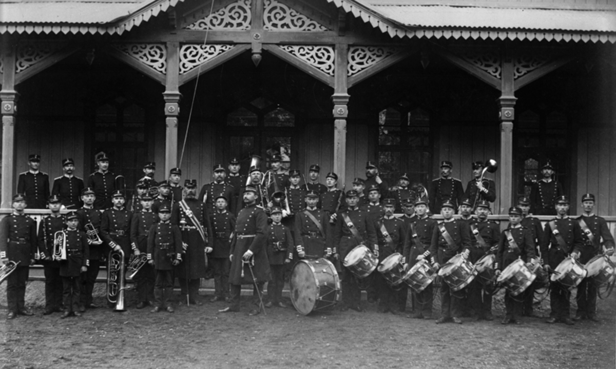 Porträtt av Andra livgrenadjärregementets musikkår framför officerspaviljongen på Malmen