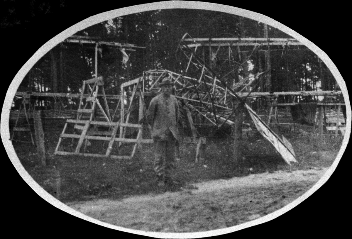 En man står vid resterna av ett havererat militärt flottörförsett flygplan, 1920-tal.