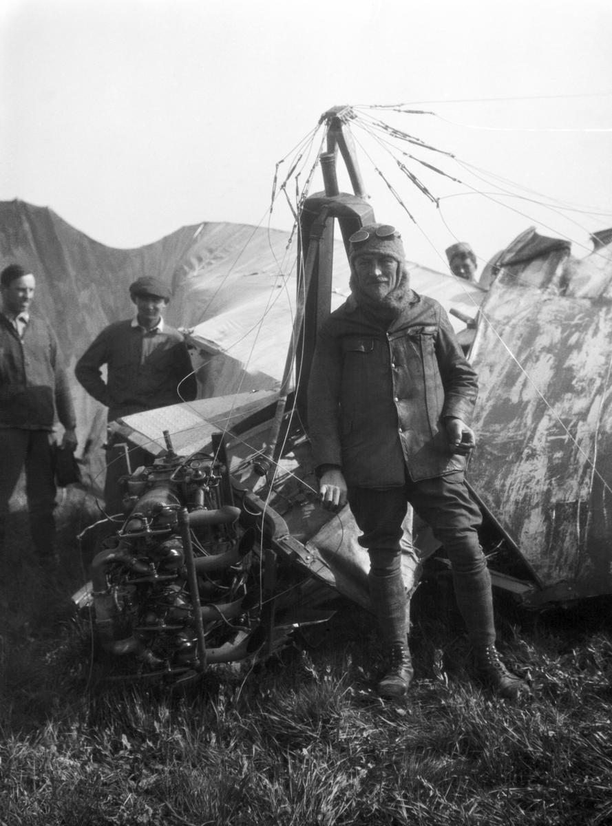En flygare står vid nosen på ett havererat militärt flygplan Etrich Taube tillhörande Österrike-Ungern. Vy framifrån.
