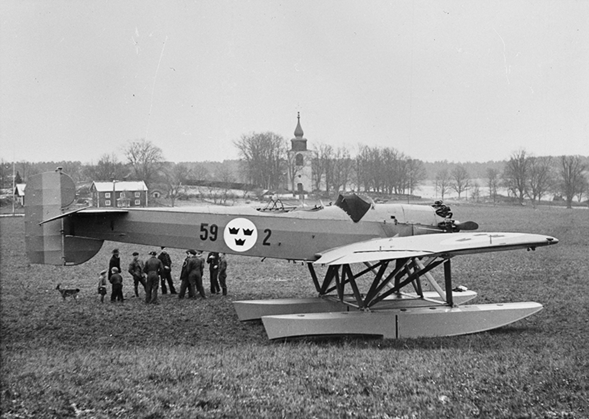 Flygplan S 5 efter nödlandning på gärde vid Östra Ryds kyrka.