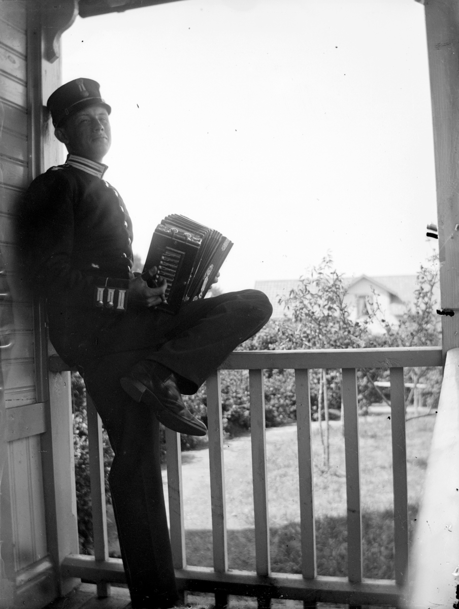 Porträtt. En armésoldat från I 4 och / eller I 5 regemente med dragspel i hand står lutad mot ett räcke på en veranda på Malmen.