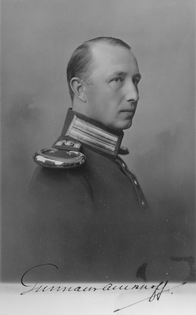 Porträtt av militära flygpionjären, Gunnar Nauckhoff från Dalregementet. Porträttet är signerat av Nauckhoff.