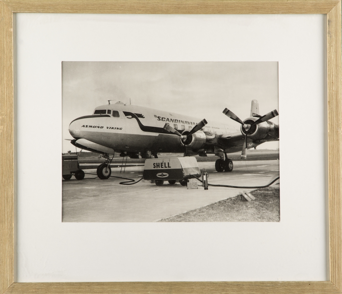 Flygplan Douglas DC-6 'Asmund Viking' på flygbana. Inramat foto.