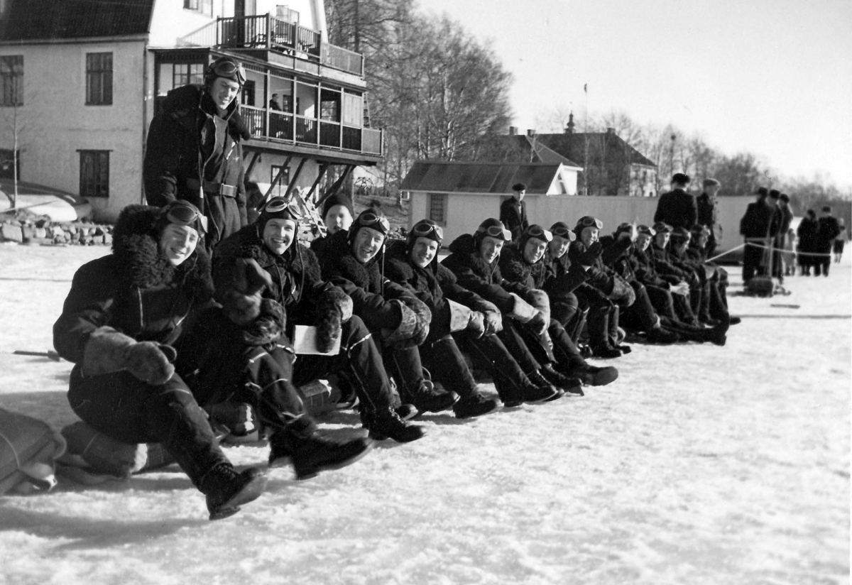 Grupporträtt av militära flygare i flygoveraller under rast, sittandes framför byggnad, vintertid. 1930-tal.