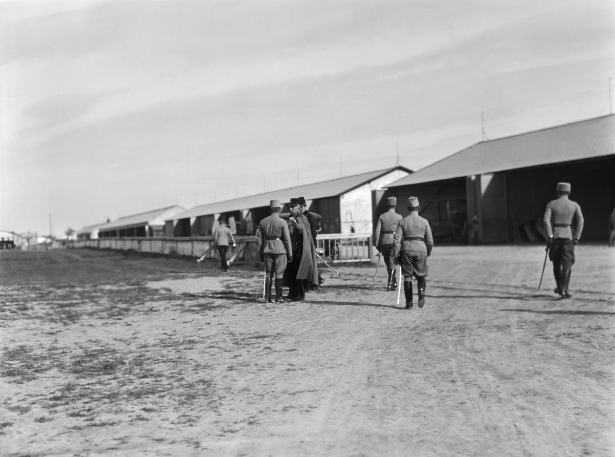Militärer från Österrike-Ungern går mot flyghangarer i utkanten av ett flygfält. Under första världskriget.