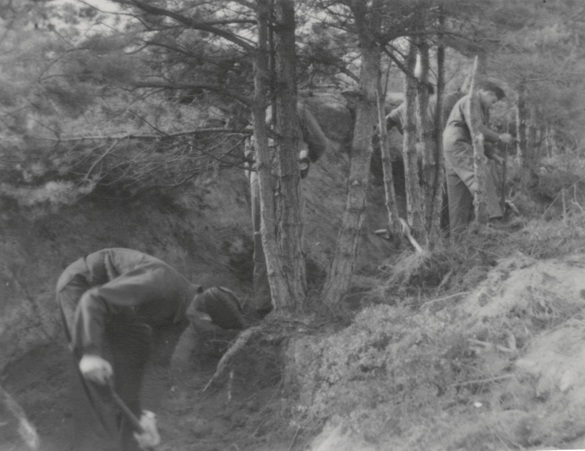 Bildtext vid foto: "Skyddsrumsgrävning Flygvapenövningen 1942."