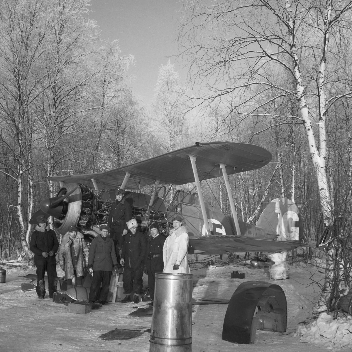 Gruppbild av militärer vid flygplan Gloster Gladiator märkt gul G under demontering efter Finska vinterkrigets slut i mars 1940 vid Svenska frivilligkåren i Finland, F 19.