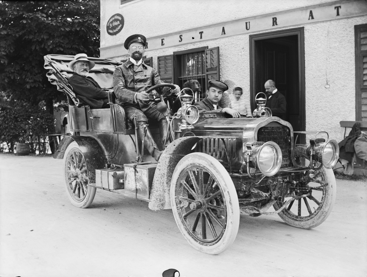 Tre män och en hund i en bil utanför en restaurang i Österrike-Ungern under första världskriget.
