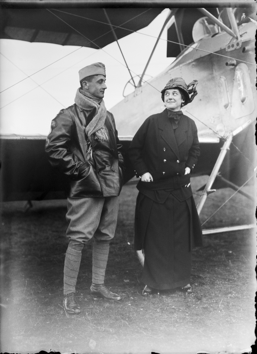 Porträttfoto av en flygare och en kvinna framför militärt flygplan Albatros B.I märkt 20.03 tillhörande Österrike-Ungern. Inför flygning i flygplanet. Mannen och kvinnan tittar på varandra.