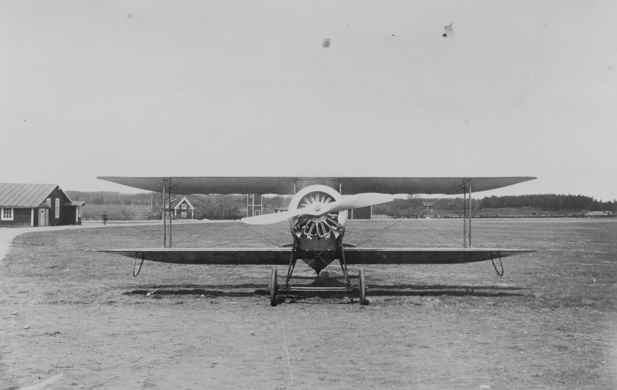 Flygplan FVM Tummelisa står på flygfältet på Malmen. Vy framifrån.