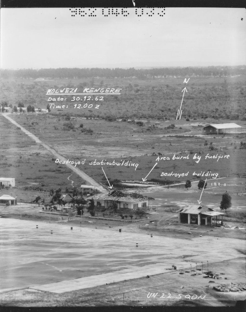 Flygspaningsbild av förstörda byggnader på flygfältet i Kolwezi-Kengere efter anfall av F 22 under Kongokrisen den 30 december 1962. Med påritad information om skador på marken och byggnader.